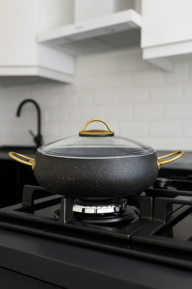 28 cm Basık Güveç Tencere – 3.5 Litre, Gold Kulplu, 4 mm Granit Kaplama, Yanmaz Yapışmaz