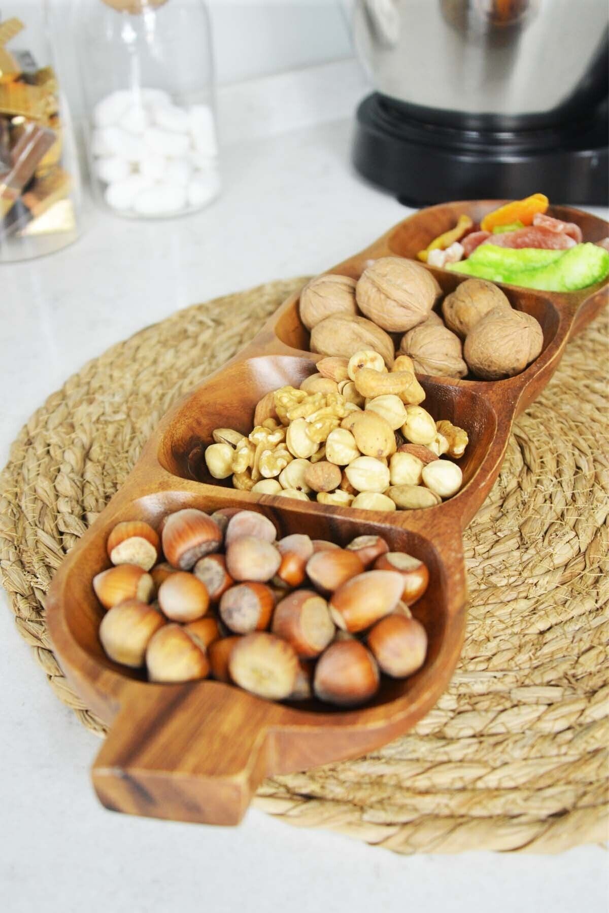 - Akasya ağacından üretilmiş, doğal ve dayanıklı malzeme ile uzun ömürlü kullanım sunar.; - Kahverengi tonlarındaki renk seçeneğiyle mutfak dekorasyonunuza şık bir dokunuş katar.; - 4 bölmeli tasarımı sayesinde çerezlerinizi düzenli bir şekilde saklamanızı sağlar ve kolayca erişebilirsiniz.; - 100 - 249 ml hacmiyle ideal boyutta olup, küçük atıştırmalıklarınız için mükemmel bir saklama çözümüdür.; - Tek ebat olarak tasarlanmıştır; her türlü mutfak düzenine uyum sağlayacak şekilde esneklik gösterir.; Akasya çerezlik, şık ve modern tasarımıyla mutfak dekorasyonunuza zarif bir dokunuş ekler; Dört bölmesi sayesinde farklı türdeki atıştırmalıklarınızı düzenli bir şekilde saklamanızı sağlar; Cam materyali ile dayanıklılık ve kolay temizlenebilirlik sunar, böylece hijyenik bir kullanım imkanı tanır; Her türlü mutfak ortamına uyum sağlayacak şekilde tasarlanmıştır; hem evde hem de ofiste rahatlıkla kullanılabilir;