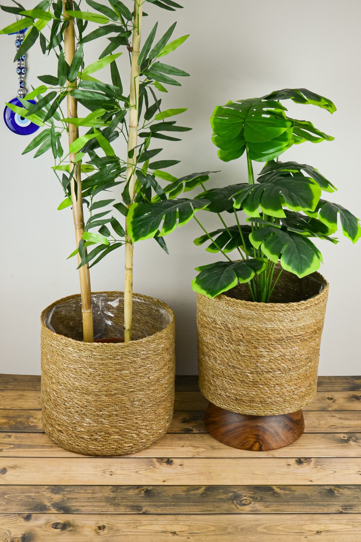 Carin - Dekoratif Doğal El Örmesi Hasır 2 li Büyük Boy Saksı Sepet Seti