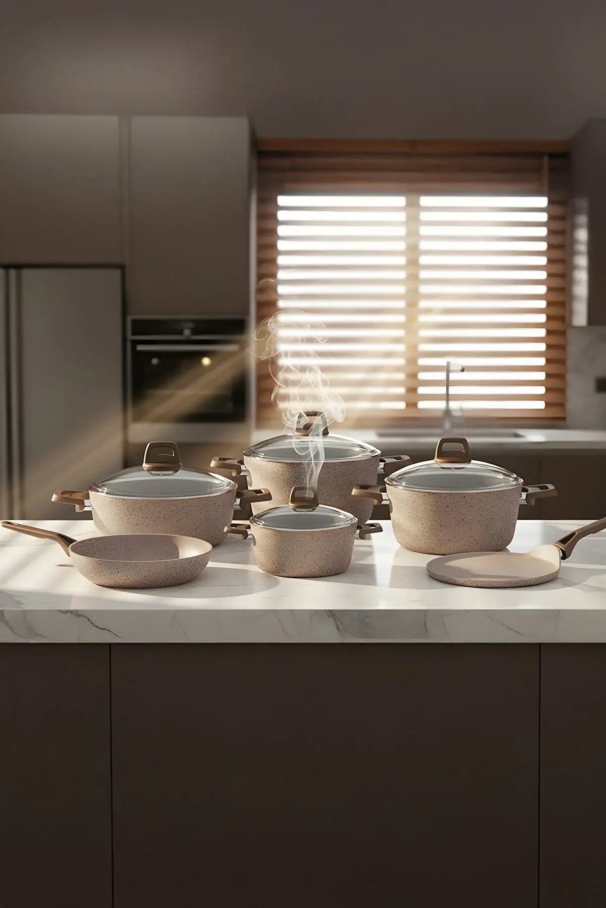 Modern mutfaklarda estetik ve dayanıklılığı bir arada sunan Castella Serisi 10 Parça Granit Tencere Seti, yemek pişirmeyi keyifli hale getiriyor.