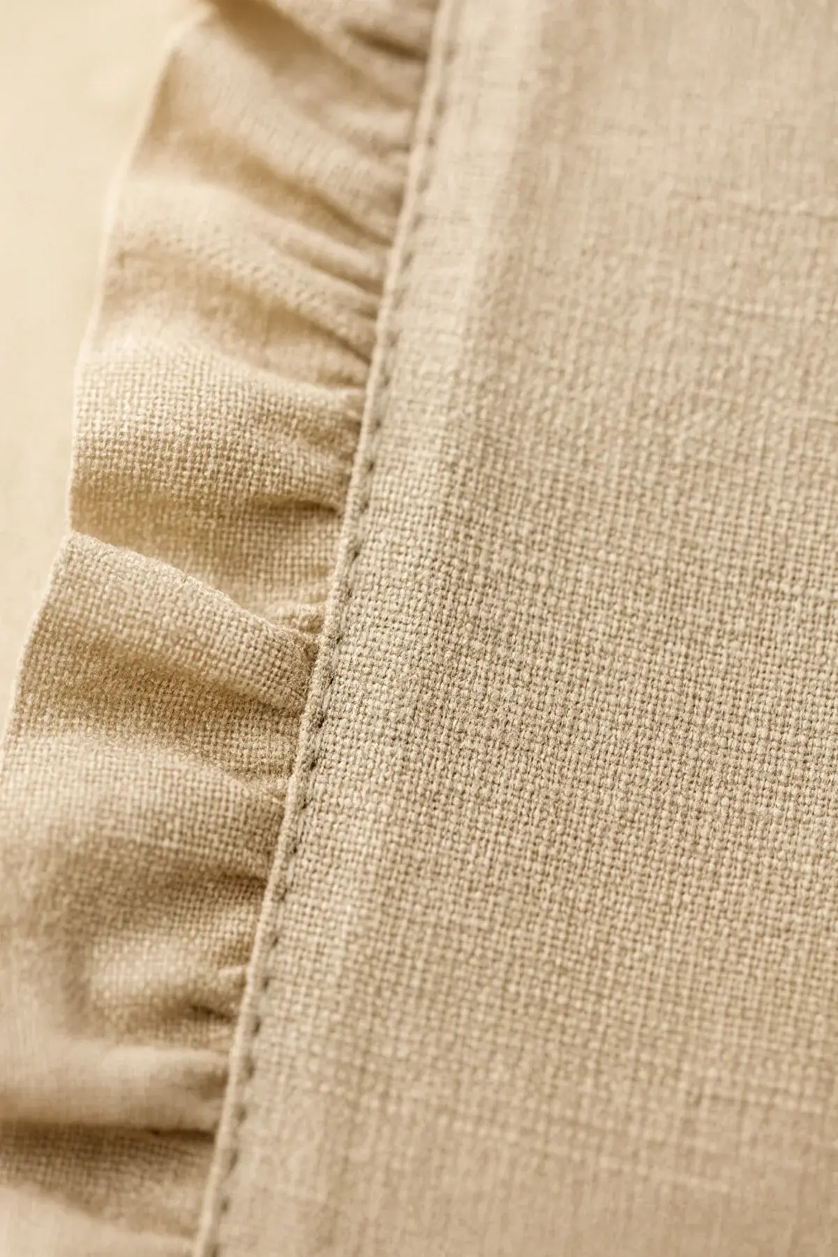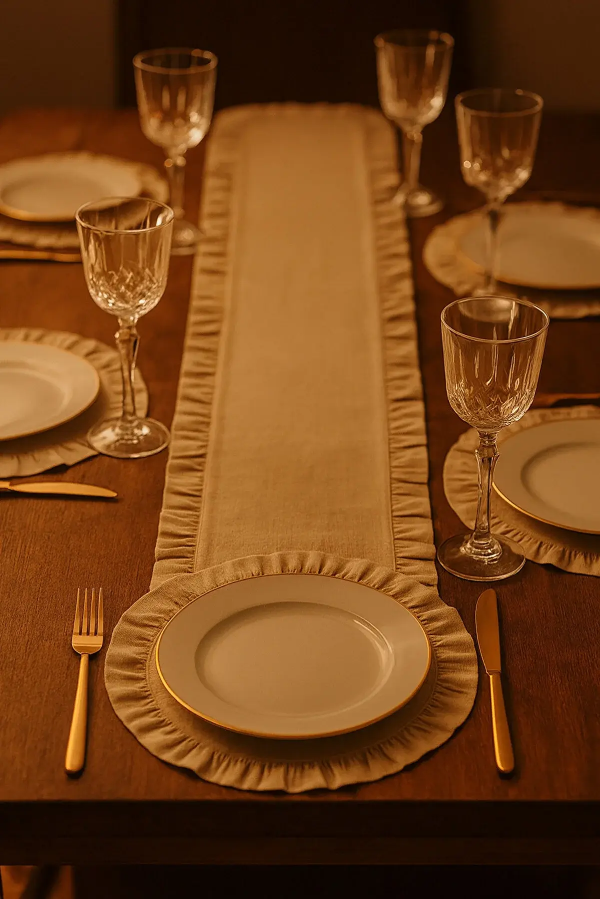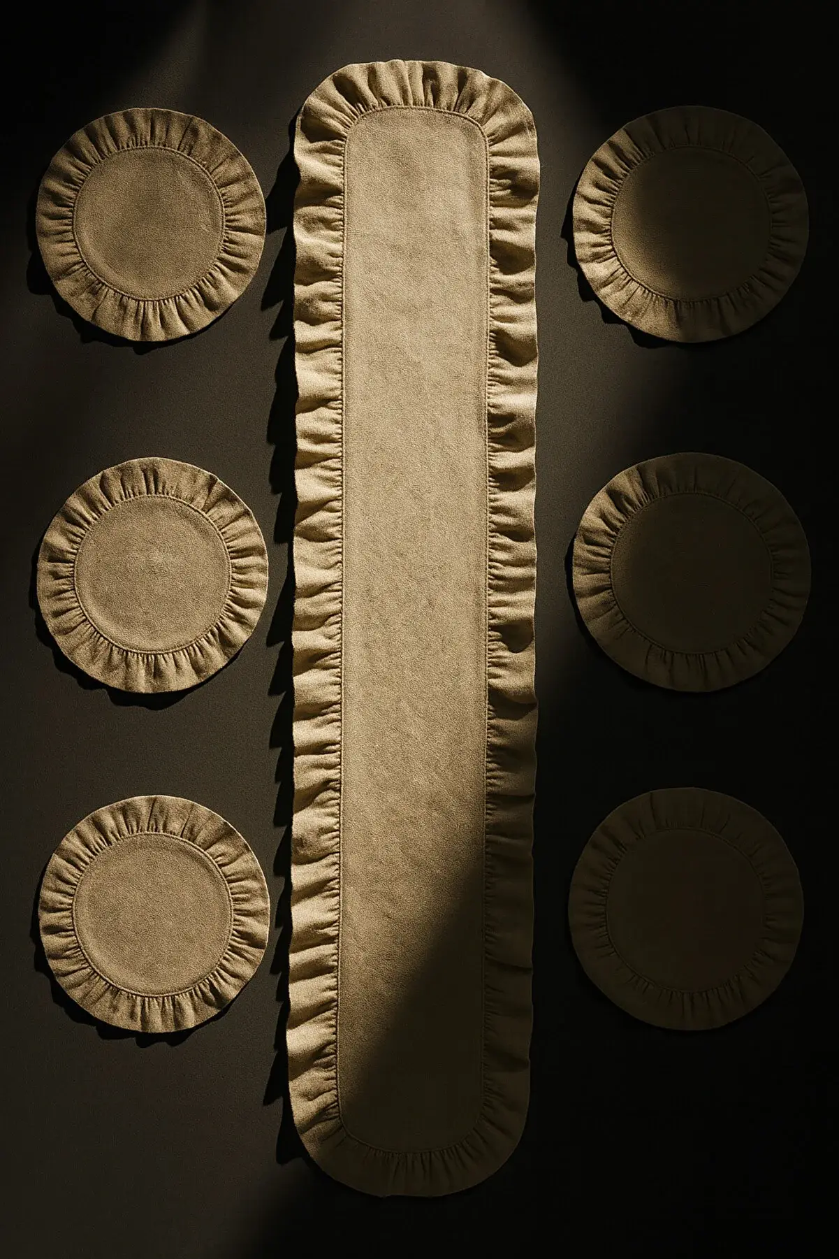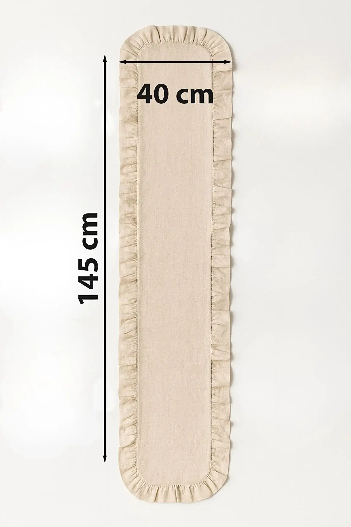 Doğal bej tonundaki kumaşı ve etrafını çevreleyen zarif fırfır detayları ile hem günlük kullanıma hem de özel davet sofralarına mükemmel uyum sağlar.
