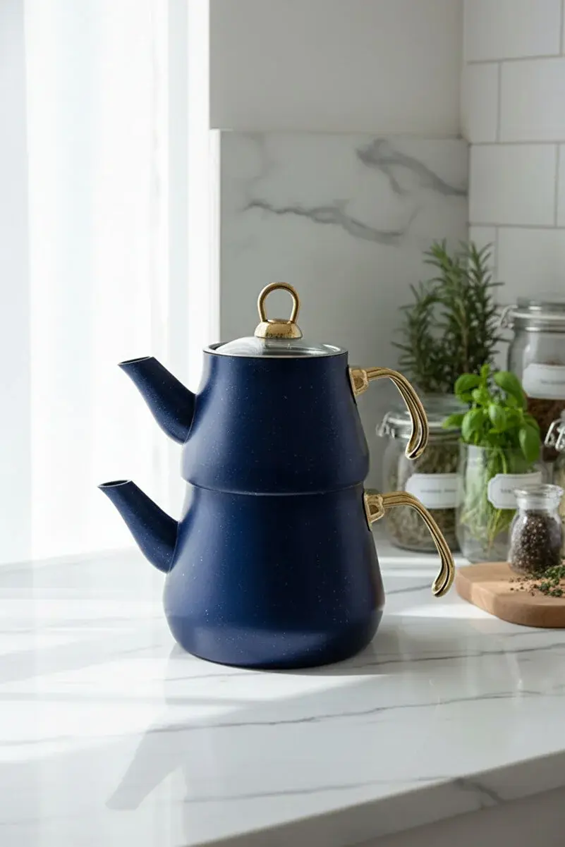 - Mavi renk seçeneğiyle mutfak dekorasyonunuza şık bir dokunuş ekler.; - Granit kaplama malzemesi sayesinde uzun ömürlü kullanım sunar ve dayanıklılığı artırır.; - 3.5 litrelik geniş hacmi ile büyük miktarlarda çay hazırlama imkanı sağlar.; - Türkiye'de üretilmiş olup yerel kaynaklı malzemelerle sürdürülebilir üretim ilkesini destekler.; - Tek ebat tasarımı, her türlü mutfak düzenine kolayca uyum sağlar ve pratik kullanım sunar.; Yunusoğlu Home Granit Kaplama Gold Kuplu Cam Kapaklı Çaydanlık Mavi Mutfağınıza şık ve kaliteli olarak çok yakışacak.; ; Hacim: Alt Çaydanlık: 2.30 lt.; ; Üst Çaydanlık: 1.20 lt.; ; Kullanma Talimatları: -Çaydanlığınızı taban çapından geniş ve harlı ateşte kullanmayınız.; ; -Parlak olan dış yüzeylerin çizilmemesi için mutlaka sıvı deterjan veya yumuşak bir bez kullanınız.; ; -Çaydanlık ve demliğinizin kireçlenmemesi için kalan çay ve su tortusunu boşaltınız.; ; - Çaydanlık ve demliğinizin iç yüzeylerini her türlü temizleme maddesi ile temizleyebilirsiniz.; ; -Demliğinizi doğrudan ateşe koymayınız.; ; -Çaydanlığınızı kesinlikle ateşte susuz bırakmayınız.;