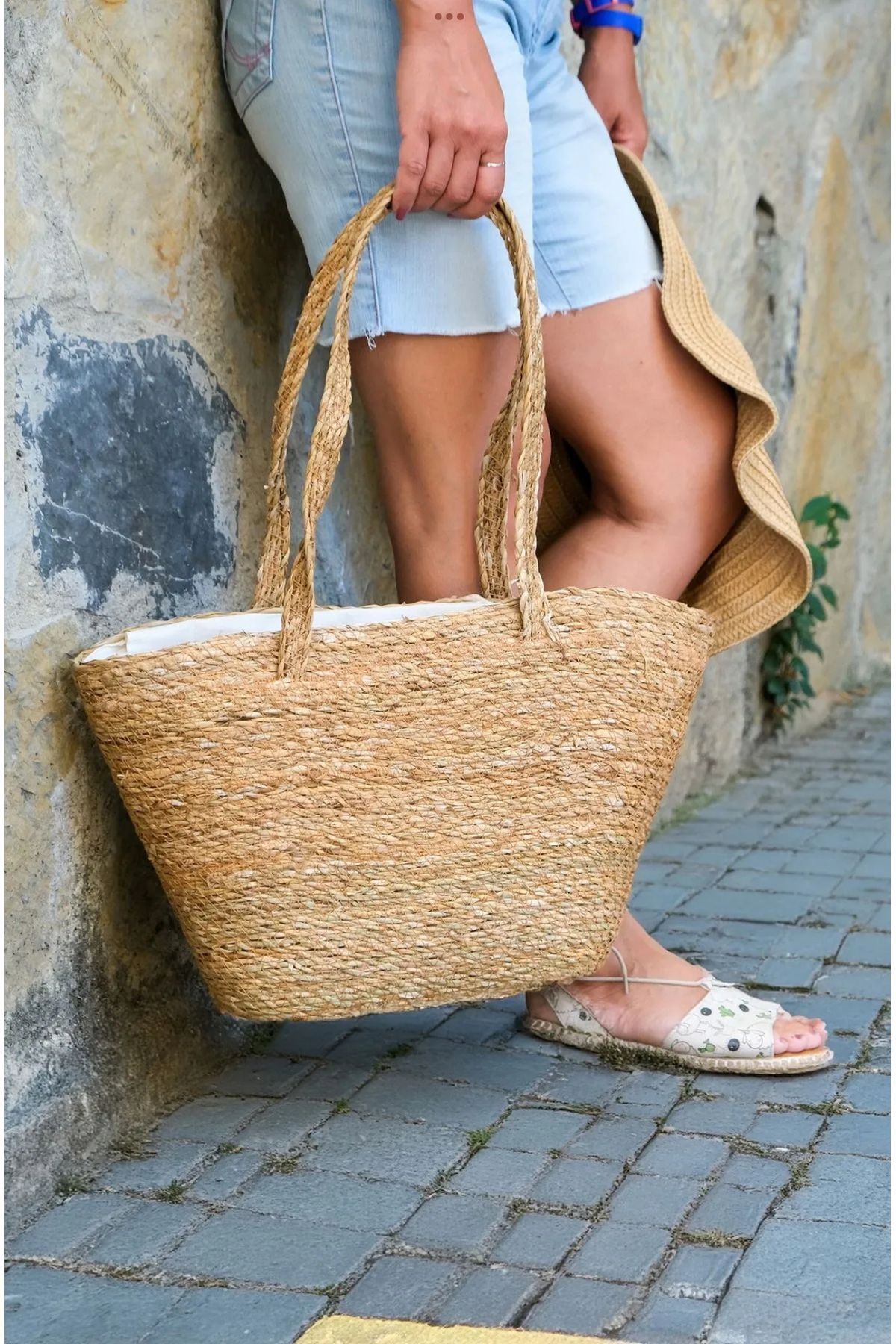Hasır Kadın Çantası Fermuarlı El Ve Omuz- Plaj Çantası 42 Cm
