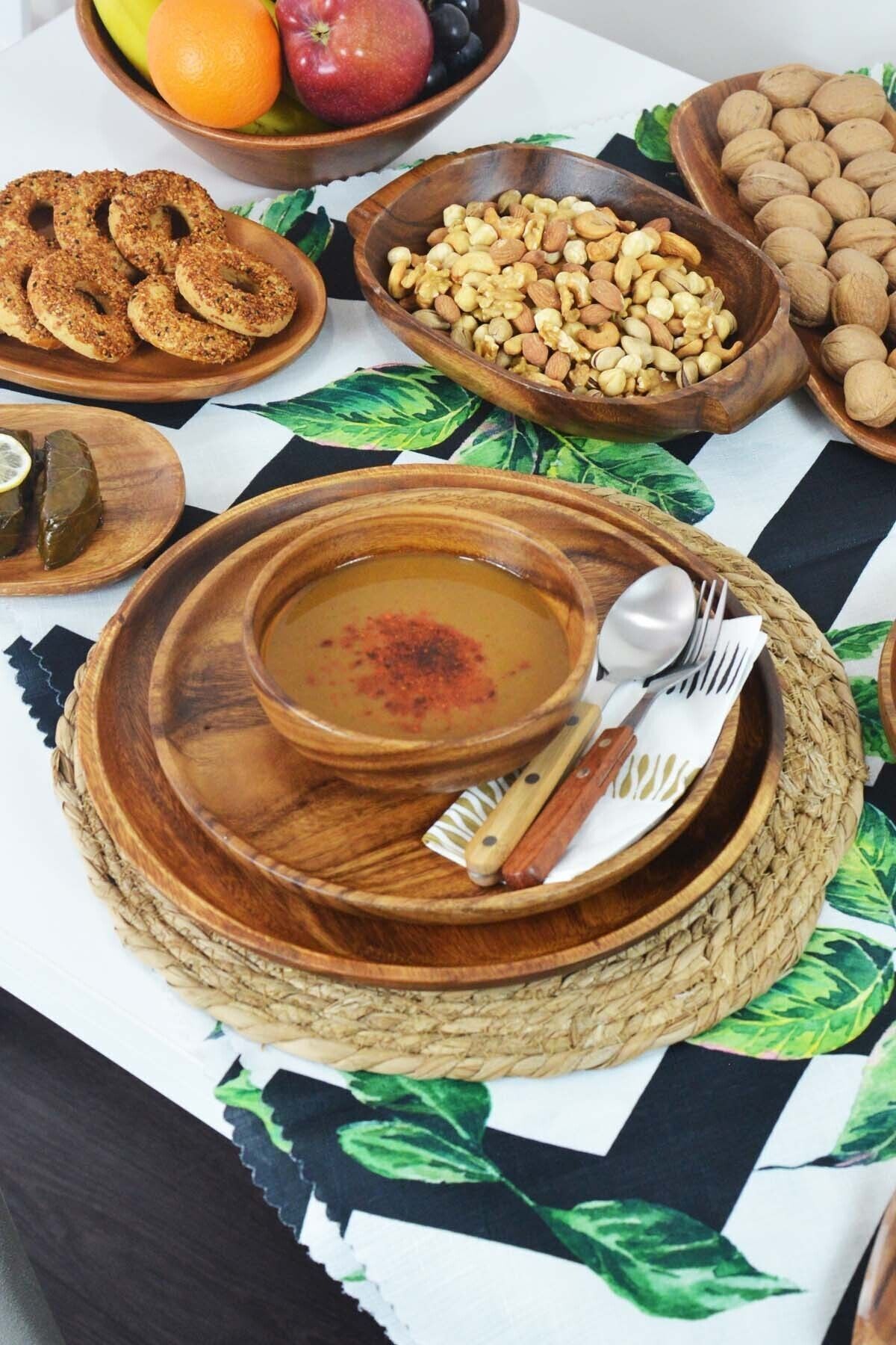 - Doğanın sıcak tonlarını yansıtan kahverengi renkteki porselen malzemesiyle, her sofraya doğal bir zarafet katıyor.; - 7'den 12'ye kadar değişen parça sayısıyla, farklı ihtiyaçlara uygun kullanım imkanı sunuyor; aile yemeklerinden özel davetlere kadar geniş bir yelpazede tercih edilebilir.; - Elde yıkanabilme özelliği sayesinde pratiklik ve kolaylık sağlıyor; temizliği hızlıca yaparak zamandan tasarruf etmenizi mümkün kılıyor.; - Yuvarlak şekli ile modern ve şık bir görünüm sergileyerek masanızda estetik bir bütünlük oluşturuyor.; - 4 kişilik ideal kişi sayısıyla küçük aile toplantılarından arkadaş buluşmalarına kadar her türlü etkinlikte rahatlıkla kullanılabilir.; - Tek ebat tasarımı sayesinde standart boyutlardaki mutfak tezgâhlarına mükemmel uyum sağlayarak kullanım kolaylığı sunar.; - Yuvarlak tasarımı ile klasik ve zamansız bir görünüm sunar, her türlü sofra düzenine kolayca uyum sağlar; - Doğa temalı stil sahibi desenleriyle sofralarınıza tazelik ve huzur katar, yemeklerinizi şık bir dokunuşla sunmanızı sağlar; - Yüksek kaliteli porselen materyali sayesinde uzun ömürlü kullanım ve dayanıklılık sunar, sık kullanımlarda bile formunu korur; - 4 kişilik set içeriğiyle aile yemekleriniz veya arkadaş toplantılarınız için idealdir; herkes için yeterli parça bulunur; - Elde yıkanabilir olması, temizliği kolaylaştırır ve bulaşık makinesi kullanımına gerek kalmadan pratik bir şekilde temizlenebilir;
