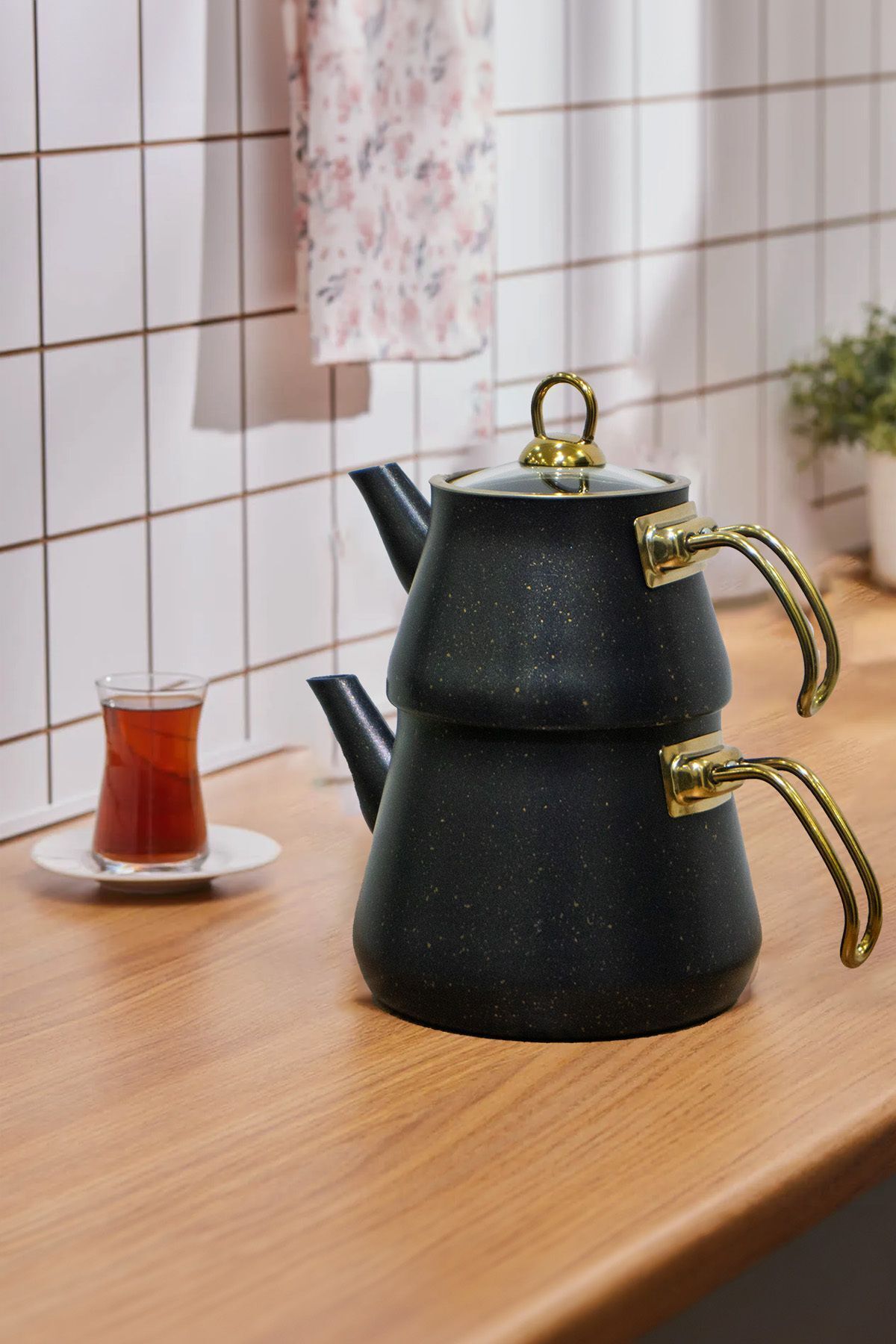 Siyah Granit Kaplama Cam Kapaklı Çaydanlık (Gold Kulplu)